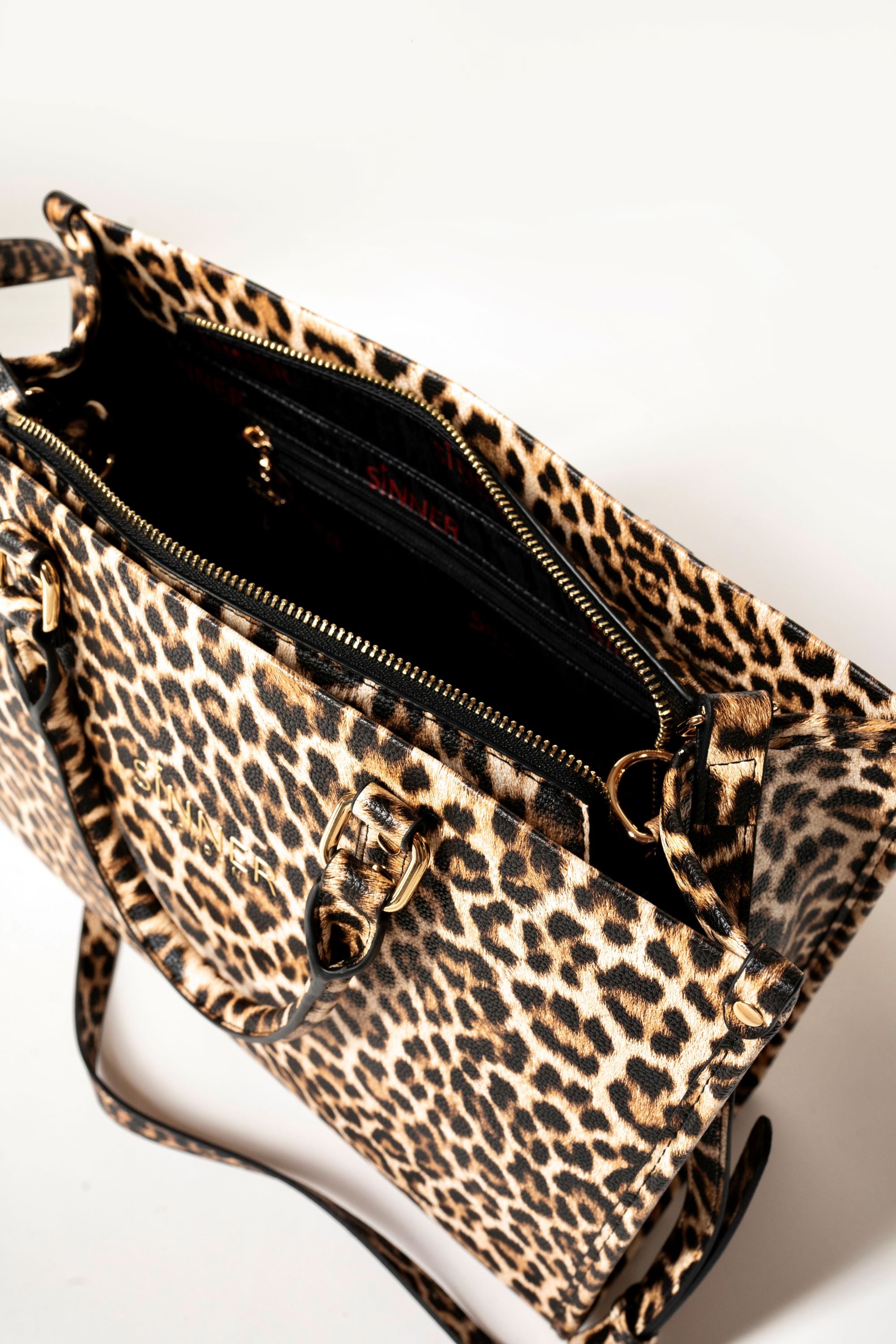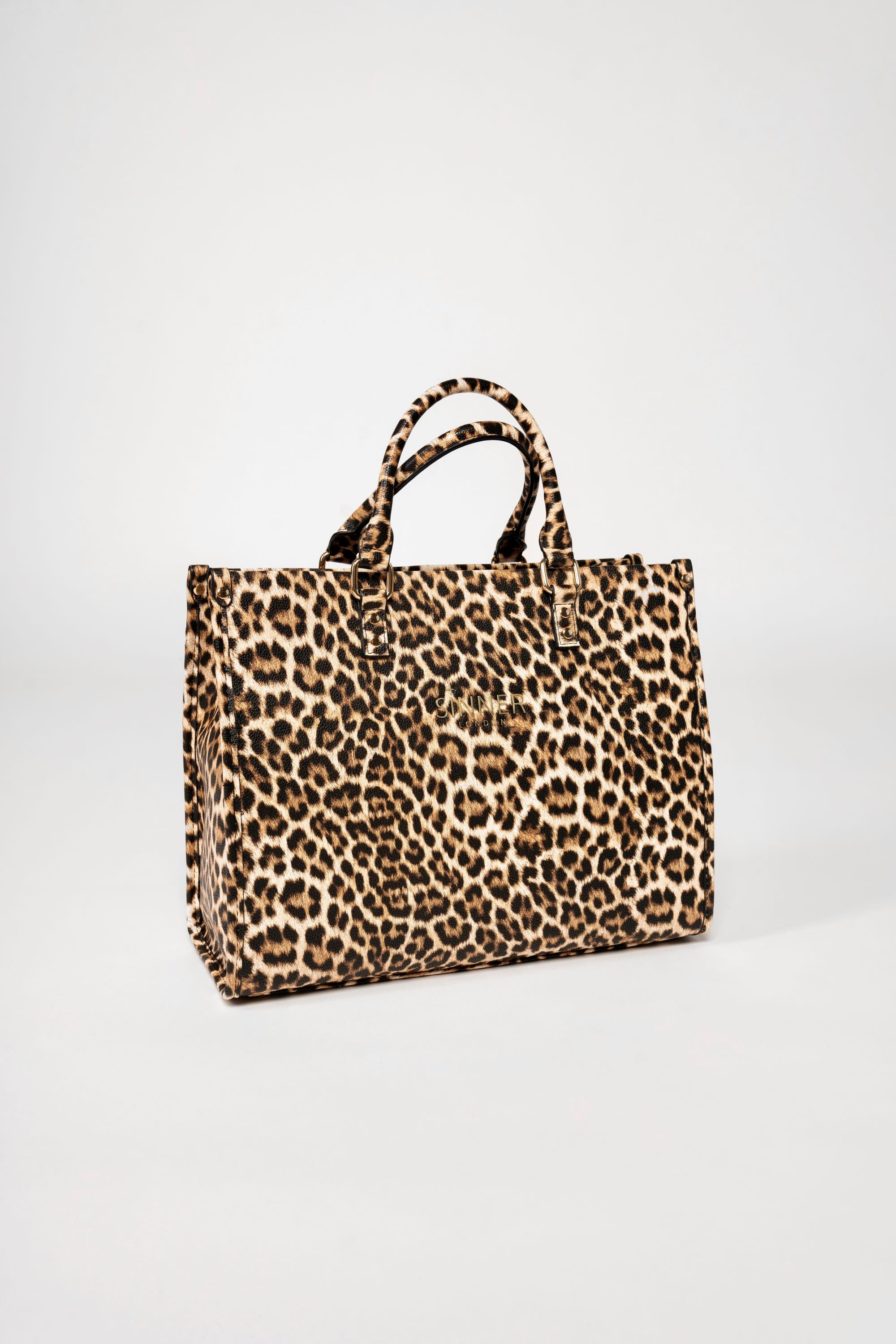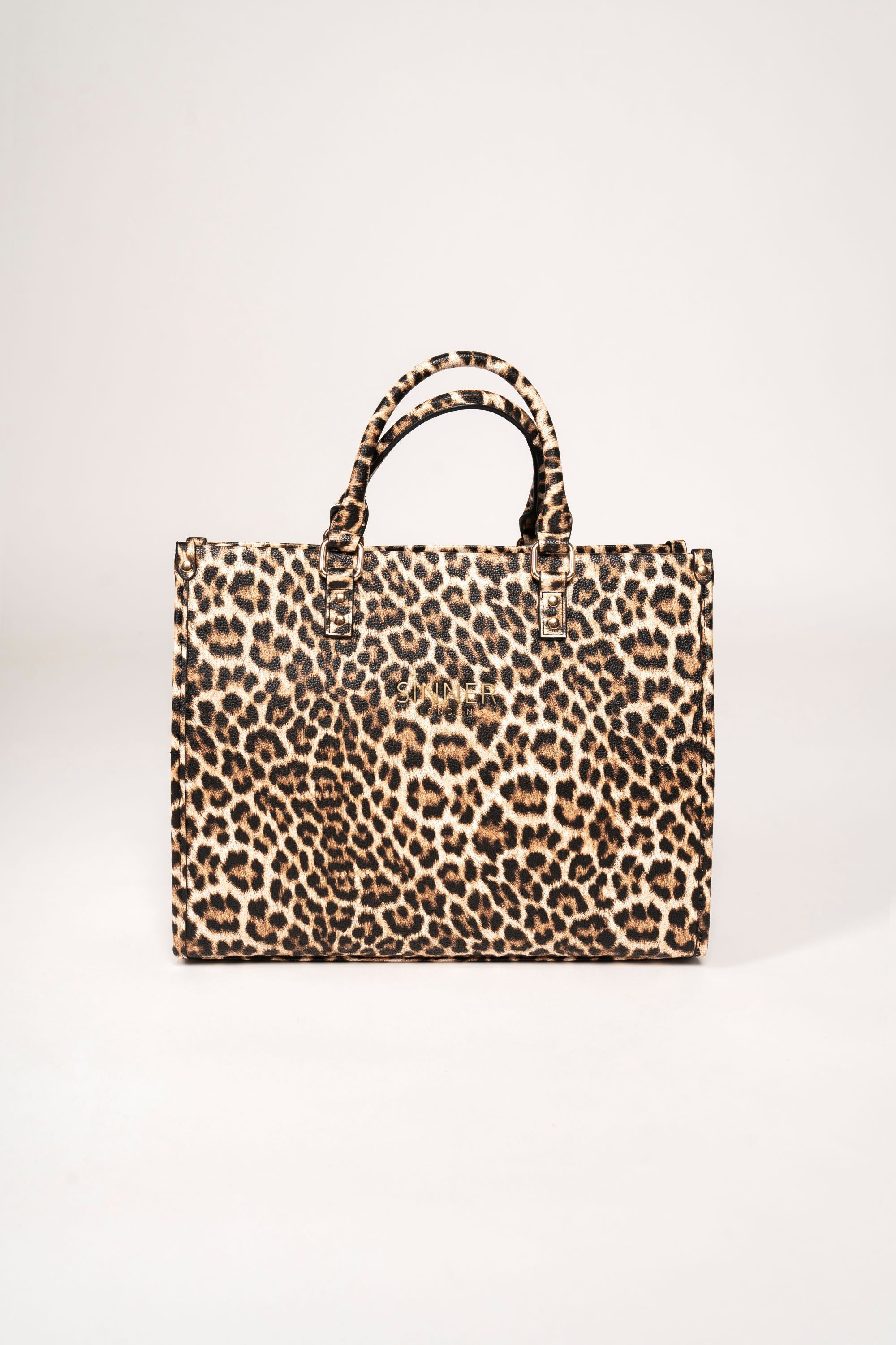 Leopard-print exterior with reinforced gold hardware.