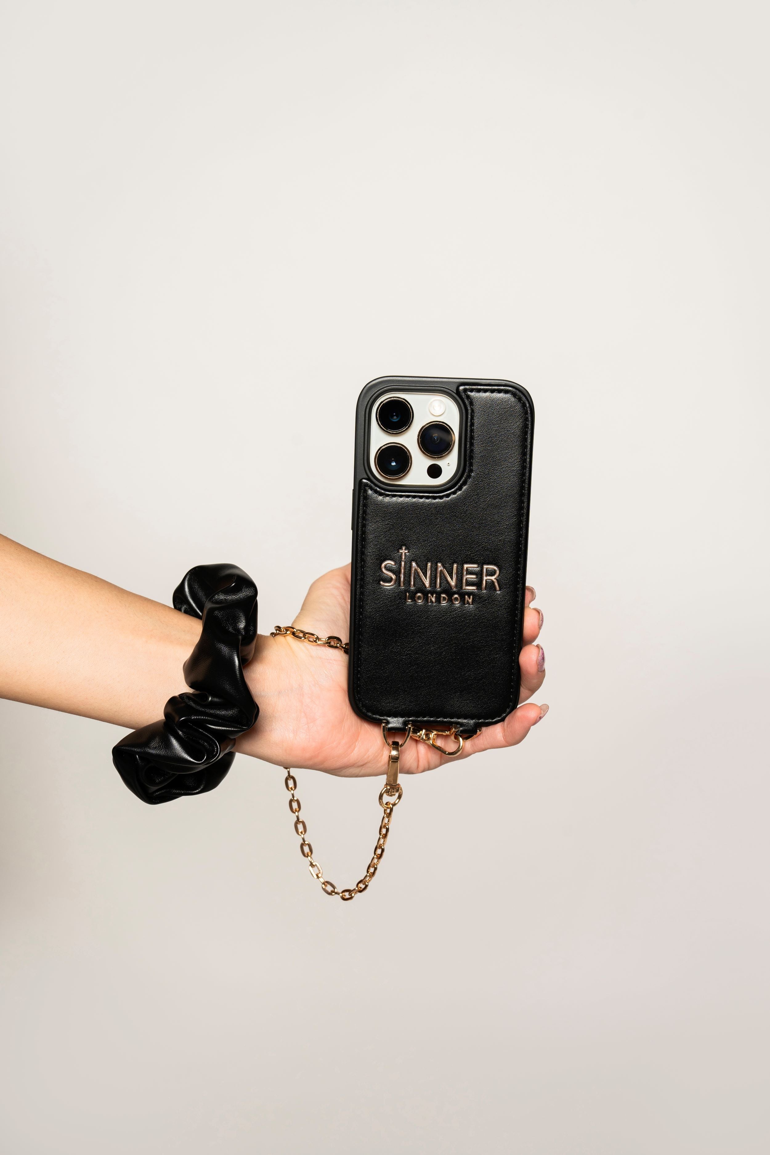Protect your phone with this high-quality black case, designed for durability and style. Featuring a detachable gold chain and an adjustable strap with metallic logo, it can be worn crossbody or handheld for versatile looks on the go. Expertly crafted to combine functionality with sleek design, it comes packed in a branded black velvet bag.